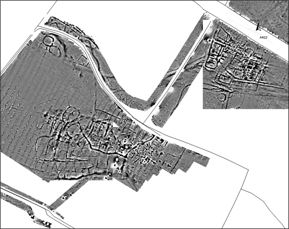 Figure 9. Geophysical survey of the area between the A422 (top right) and the straight mile (top left) showing density of probable structures, enclosures and ditches  (courtesy of David Sabine)