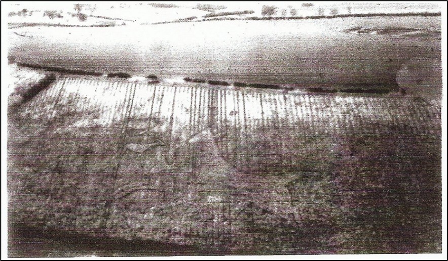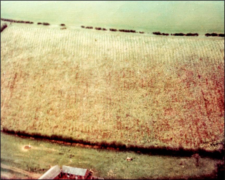 It was only when they implemented a broader set of techniques that signs began to look promising. Observations and photographs taken from the valley indicated a substantial anomaly above Old Lodge Farm which they considered was significant.  Aerial photography, including infra-red photography, appeared to show a subtle change in the vegetation (Figure 19).  Not only did this occur in the broad area traditionally viewed as being the site of the Red Horse, but it also generally matched the spread of Arrhenartherum elatius (False oat grass) observed and recorded on site visits.  A vegetation and soil survey undertaken by Dr Geoffrey Dimbleby from University College, London proved inconclusive but a geophysical survey by specialists from the Radley Institute in 1967 revealed clear evidence of disturbed ground in the area identified from the aerial photographs.