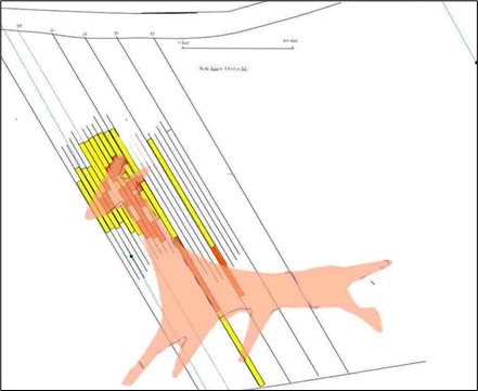Figure 20. Resistivity 1967 survey results (yellow transects) with cropmark plot superimposed
