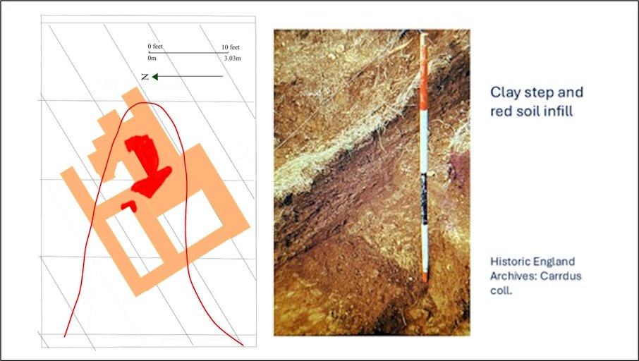 Carrdus and Miller then set about a renewed small scale excavation to identify the nature of sub-surface changes that were causing these geophysical anomalies and vegetation effects. The exact position and size of all their trenches is unclear from their documentation but two were dug across one of the ears and the neck respectively, and a possible third one across a hoof (Figure 21). The results were unexpected and quite remarkable. They discovered that, far from a horse being outlined by a trench, like the Uffington Horse and the Cerne Abbas Giant, the whole beast had been excavated, with a deeper trench around the shape’s edge.  Even more significantly for further investigations the shape had not been produced by simply clearing away the turf, it had involved extensive digging to a depth of between 50 and 80cm across the board (Figure 22).  The reason for this seems to have been that the geology of the escarpment in that location is predominantly grey-green clay (the Dyrham Formation) with the capping of the red Marlstone Formation (Hornton Stone) lying many metres further up the slope (See The escarpment through the ages). Any horse shaped feature cut to reveal this dull green-grey subsoil would be invisible from any distance.  The red soils and rock are certainly present in the excavated trenches but are not in situ geologically. To colour the horse red marlstone rock had been quarried from elsewhere, presumably from higher up the slope where it sat within the natural strata, then transported to the site and used to fill the large horse-shaped excavation.